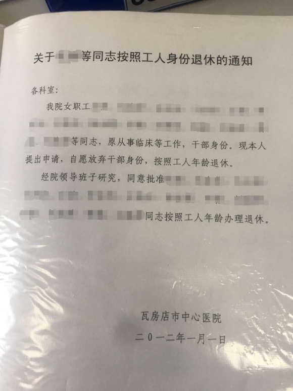 界面新闻获得的一份《关于##等同志按照工人身份退休的通知》载明,##等同志“原从事临床等工作,干部身份。现本人提出申请,自愿放弃干部身份,按照工人年龄退休。”这份通知落款为瓦房店市中心医院,时间为2012年1月1日。