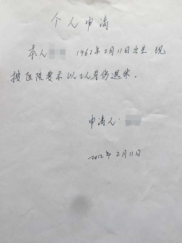 瓦房店市中心医院的多位老职工称,这些原为“干部身份”的女职工,并非本人主动申请放弃“干部身份”,而是在医院的要求下让她们提出申请的。其中,一位医生于2012年2月11日所写的申请书载明:本人##,1962年2月11日出生,现按医院要求以工人身份退休。