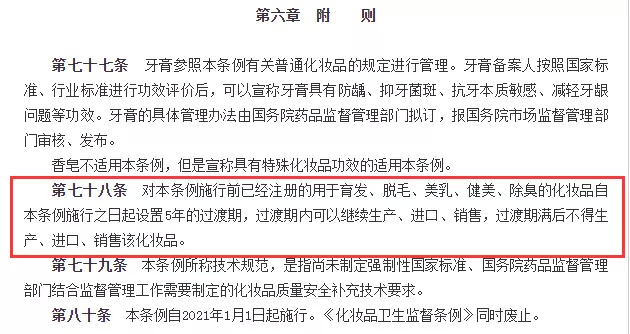 新条例附则第七十八条规定:对本条例施行前已经注册的用于育发、脱毛、美乳、健美、除臭的化妆品自本条例施行之日起设置5年的过渡期,过渡期内可以继续生产、进口、销售,过渡期满后不得生产、进口、销售该化妆品。