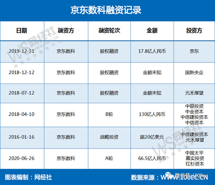 据网经社电商大数据库“电数宝”(DATA.100EC.CN)监测数据显示,京东数科共获得6轮融资,总融资金额超350亿元。2016年1月,京东金融完成由红杉资本中国基金、嘉实投资和中国太平领投的66.5亿元A轮融资,彼时估值达到466.5亿元。2017年6月,京东金融完成股权重组交割,正式“走出”京东集团独立。