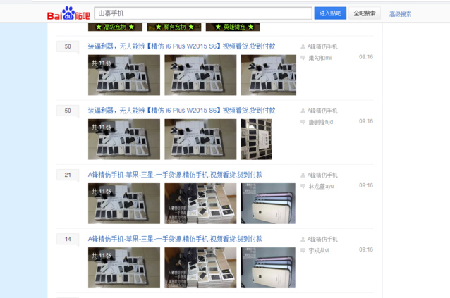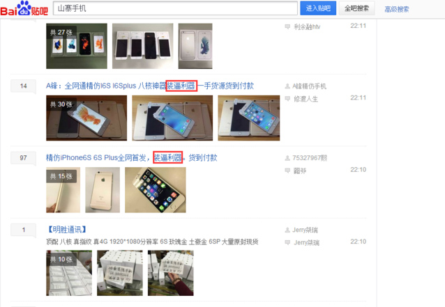 与荣耀7一样,受到山寨商家们热门关注的机型还有iPhone6s和三星S6等一系列成功机型,在贴吧内这些机型的报价往往只有千元左右。良心一些的商家会注明这是山寨机,黑心商家则是直接卖往“无人识货”的四五线城市。此次“假华为商场”上的精仿货源很大一部分其实正是来自于山寨厂商。