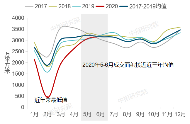图:2017-2020年6月50个代表城市商品住宅月度成交面积走势