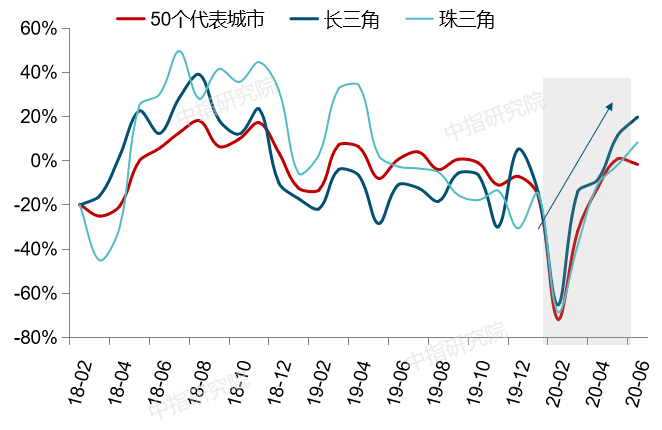 图:2018年以来50个代表城市及长三角、珠三角代表城市商品住宅成交面积同比走势