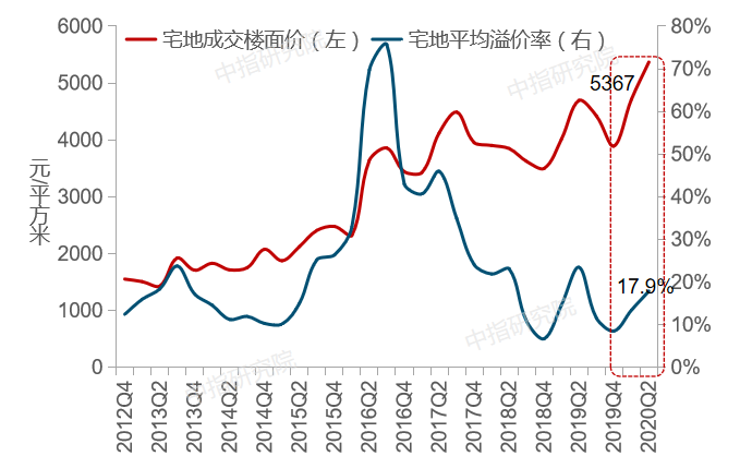 图:2012-2020年二季度全国300城住宅用地成交楼面均价及平均溢价率