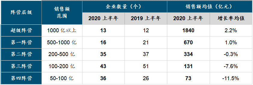 表:2020年上半年房企各阵营数量及销售额均值情况