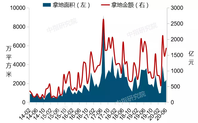 图:2014年-2020年上半年代表企业拿地面积和金额情况