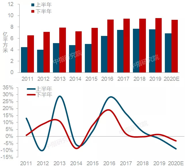 图:2011至2020年全国商品房销售面积上、下半年规模及同比变化
