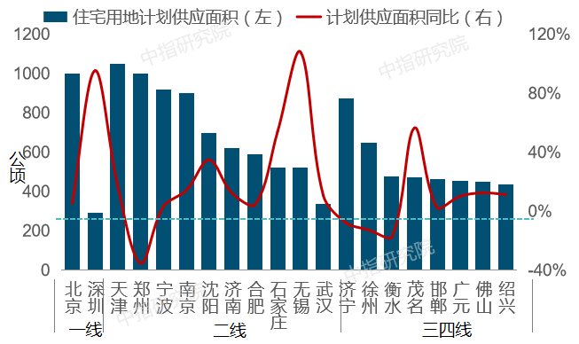 图:2020年各线代表城市住宅用地计划供地面积及同比变化