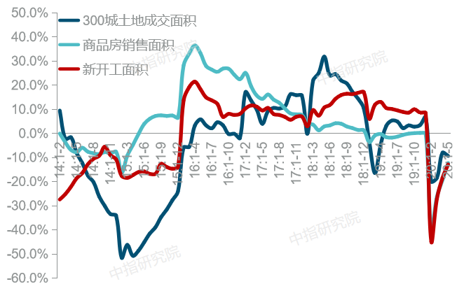 图:2014年以来房屋新开工面积、商品房销售面积与300城土地成交面积同比走势图
