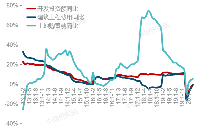 图:2014年以来全国房地产开发投资额与土地购置费、建筑工程投资费用同比变化