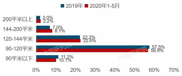 从30个城市住宅项目销售套数占比情况来看,2020年1-5月,120-144平米、144-200平米之间和200平米以上的改善型产品销售套数较2019年均有所增多,居住需求不断升级。根据最新中指百城居民置业意愿调查结果显示,6月,近四成受访者表示短期购房需求为换房改善,改善型需求占据重要地位。此外,受当前城市居民居住特征影响,各类置业群体也更为偏好三居类中大户型产品,此类产品需求占比为44%,明显高于其他类型。预计随着疫情影响不断减弱,市场换房需求仍存较大释放空间,且在限购等政策影响下,部分购房者更倾向选择一步到位的产品,中高端项目成交占比有望继续上升。