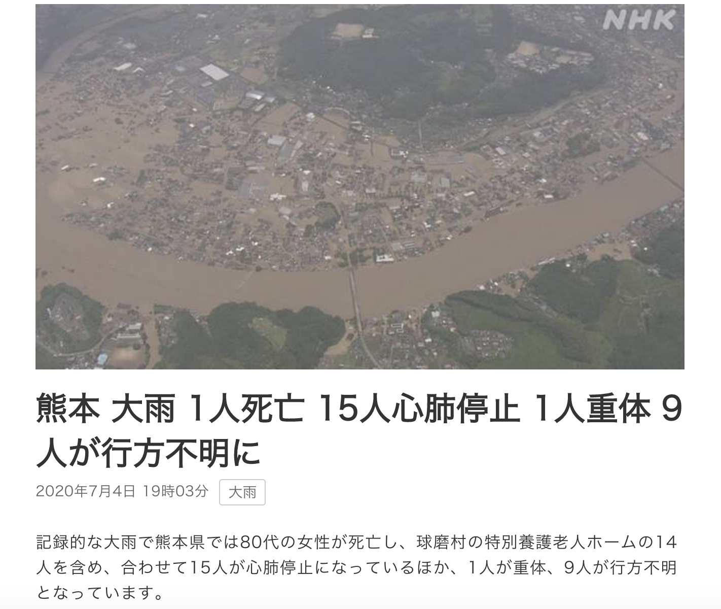 熊本县政府说,当地一家养老院遭洪水淹没,14人呼吸、心跳停止,津奈木町1人没有呼吸和心跳,合计15人。此外,芦北町发生山体滑坡造成房屋倒塌,致使一名80多岁女性死亡。
