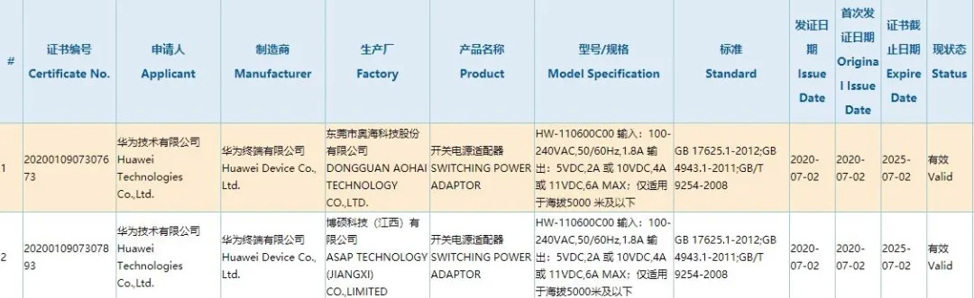 不仅是小米,华为也在同一天通过了一款功率为66W的快充头,疑似是下半年旗舰Mate 40的附赠充电器。功率虽然不及小米的120W,但根据传闻,华为的100W快充也在路上了。