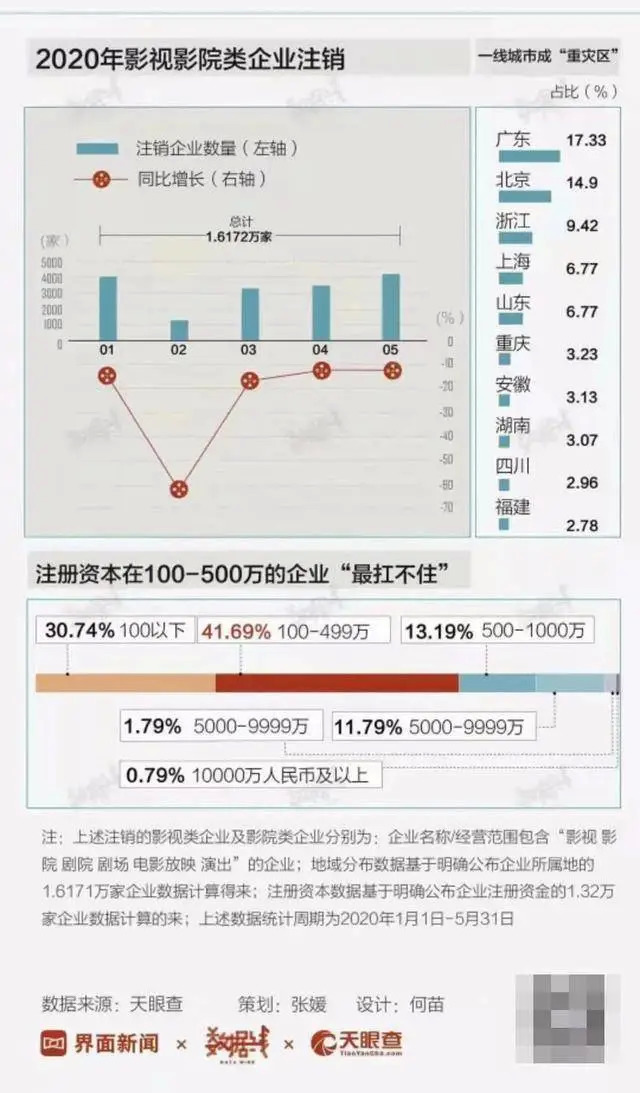 最近的数据是在这162天停业里,超过1.6万家影视类企业注销,其中注册资金在100-500万之间的企业占72.4%;另据估算,将有超过三成即近5000家电影院倒闭。注定不会是所有影视人,都能渡过这个最长的寒冬。