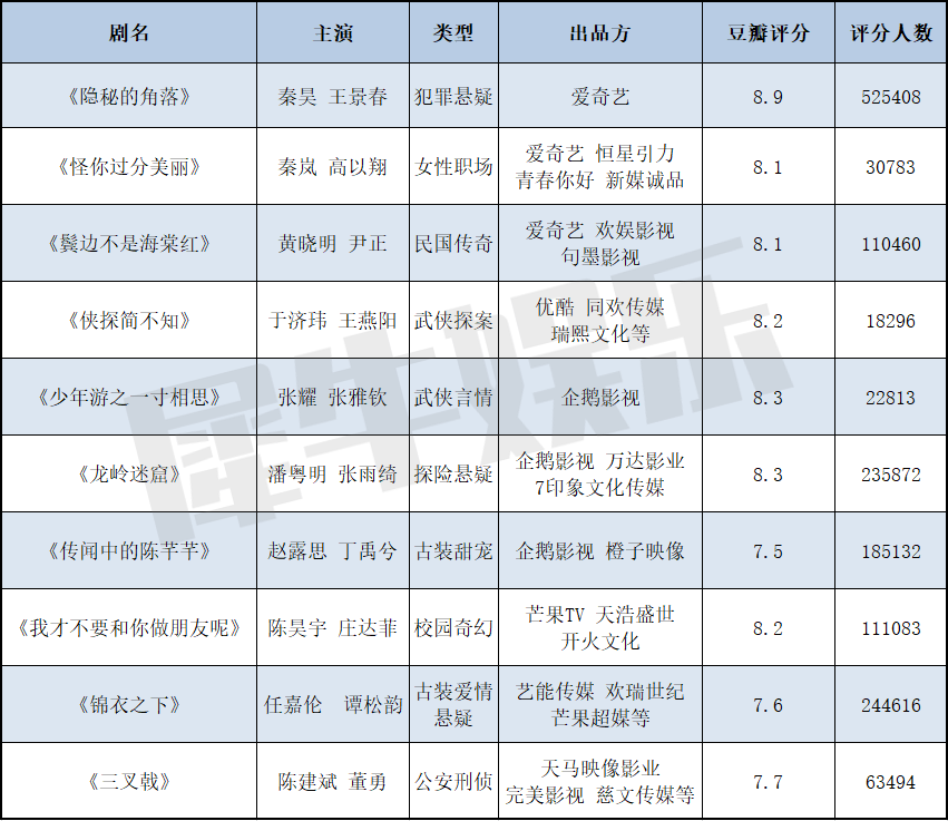 实际上,回看2020年上半年的剧集市场,这三大趋势已经表现得很明显了,尤其是在《隐秘的角落》《龙岭迷窟》《侠探简不知》《我才不要和你做朋友呢》《三叉戟》等上半年产出的10部口碑剧(豆瓣评分≥7.5,评分人数过万)身上。