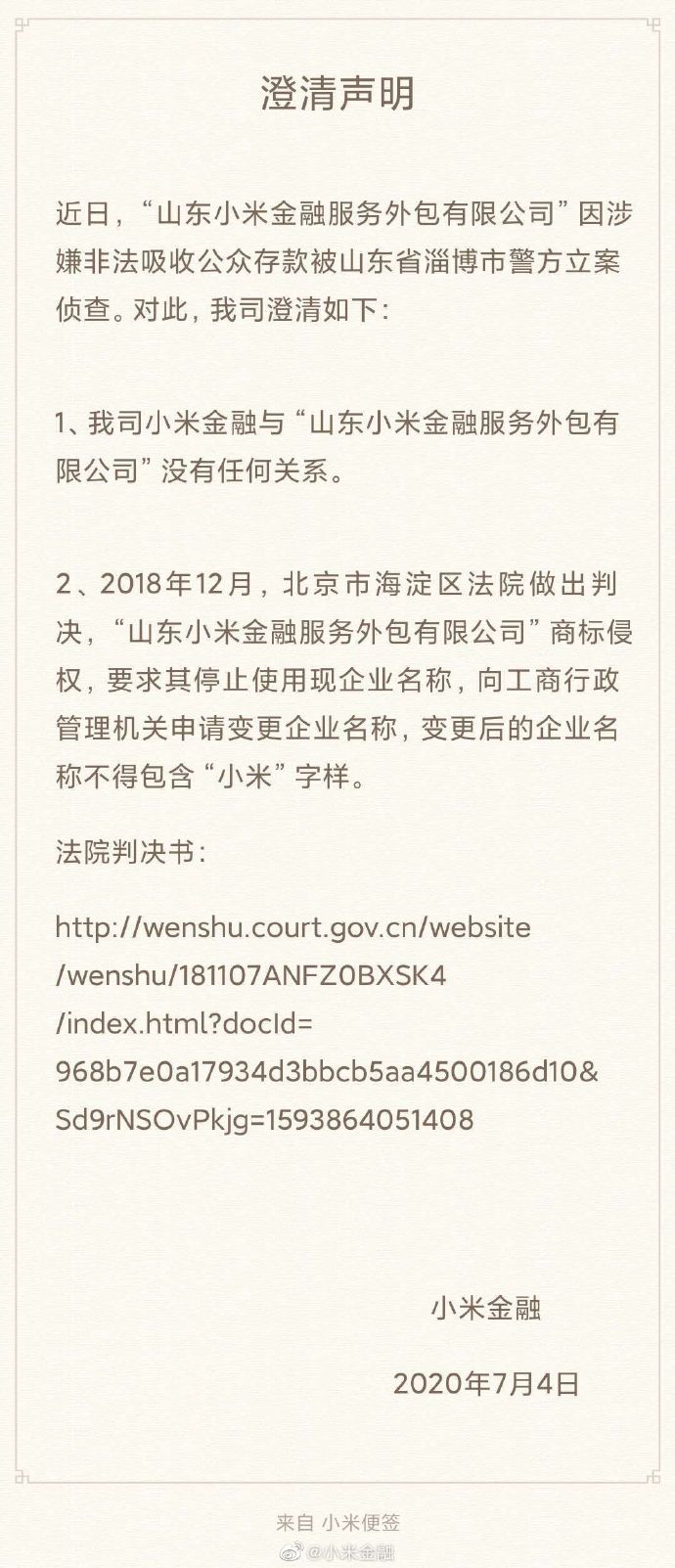 小米金融4日晚在微博发布澄清声明,称近日“山东小米金融服务外包有限公司”因涉嫌非法吸收公众存款被山东省淄博市警方立案侦查,小米金融与该公司没有任何关系,且2018年12月曾通过法院要求对方停止使用现企业名称,并向工商行政管理机关申请变更企业名称,变更后的企业名称不得包含“小米”字样。