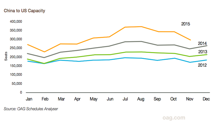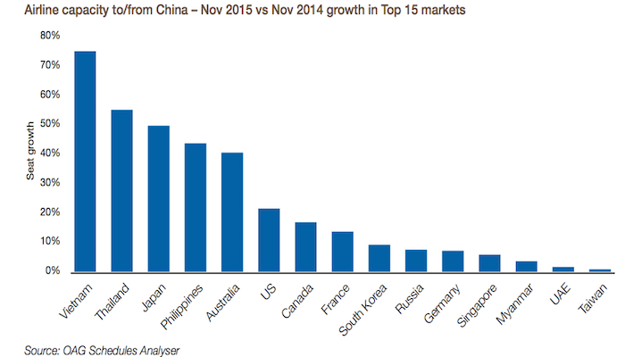 过去一年,中国修建许多新机场,航空公司大量购买新飞机并且申请开通航线,尤其是热门国际航线,由此带来国内航空市场的小爆发。OAG的数据显示,今年11月,国内航班飞机座位数增加310万座,运力增长8%,而体量较小的国际航班运力增幅更为明显,同比上升20%,增加90万个座位。