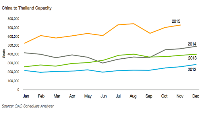 中国至泰国的航空市场一直以来都是各家航空公司觊觎的肥肉,航空运力月度环比增长达到5%。去年,国外3家低成本航空公司进入这个市场,但是大部分增加的航班都是由中国的航空公司承担运营,包括中国国航、深圳航空、南方航空、四川航空、厦门航空、海南航空等中国公司。
