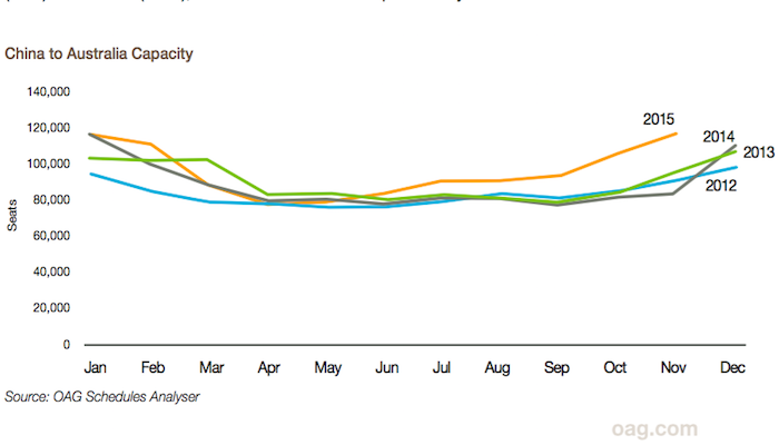 过去的一年内,国内的航空公司都在申请开通国际航线,增加运力。澳大利亚就是一个明显的例子。今年11月份,两国之间的航班座位数增加了40%,航班次数增加109至438,最新入场的是厦门航空,它在今年11月开通了从福州到悉尼的航班。