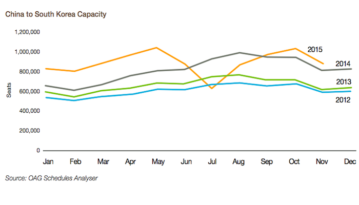 尽管年中受到MERS(中东呼吸综合征)的不利影响,今年中韩之间航空交往的频次依然在不断增加。今年11月,航班座位数量同比去年增加10%,与此同时,航班次数增加11%,热度依然不减。