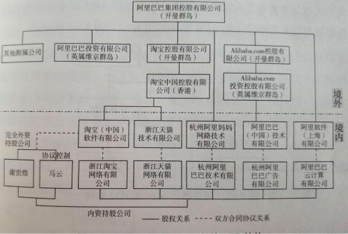 以阿里巴巴为例,上市主体是在开曼群岛注册的阿里巴巴集团控股有限公司,然后在境内设立子公司,这些子公司通过协议控制着各种经营实体,这些经营实体均为马云和谢世煌持股的内资公司。
