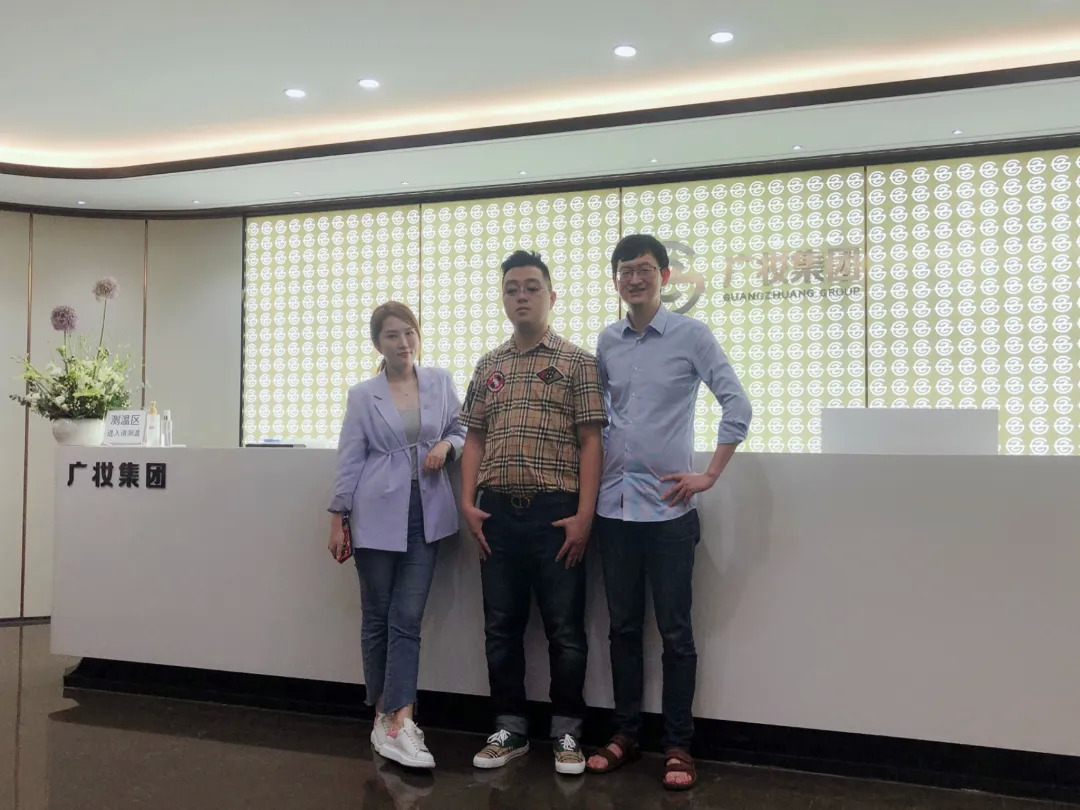 聚美丽探访梵蜜琳总部广妆集团,居中者为梵蜜琳创始人蔡彬弟