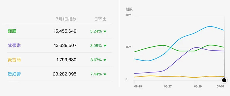 在微信指数上,“贵妇膏”、“梵蜜琳”热度飙涨,甚至超过了“面膜”关键词的热度。