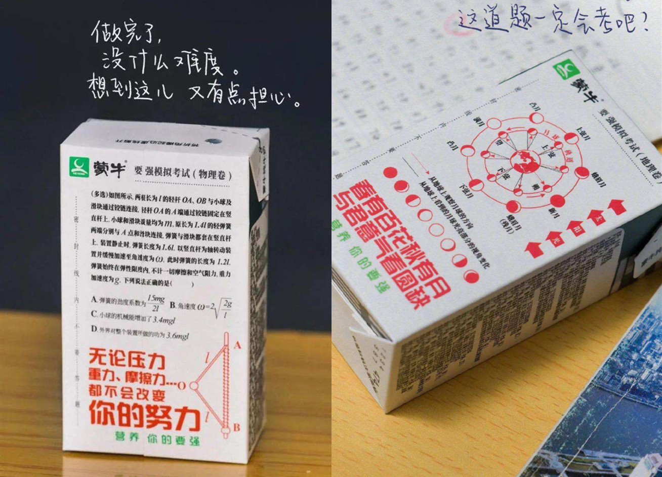 只不过,2020年的高考因为新冠疫情,推迟了一个月,又回到了新世纪之前的七月;而这一波高考营销里,蒙牛也玩了把突破,推出了高考押题奶,各类学科试题印到牛奶盒上,为高考硬核押题。