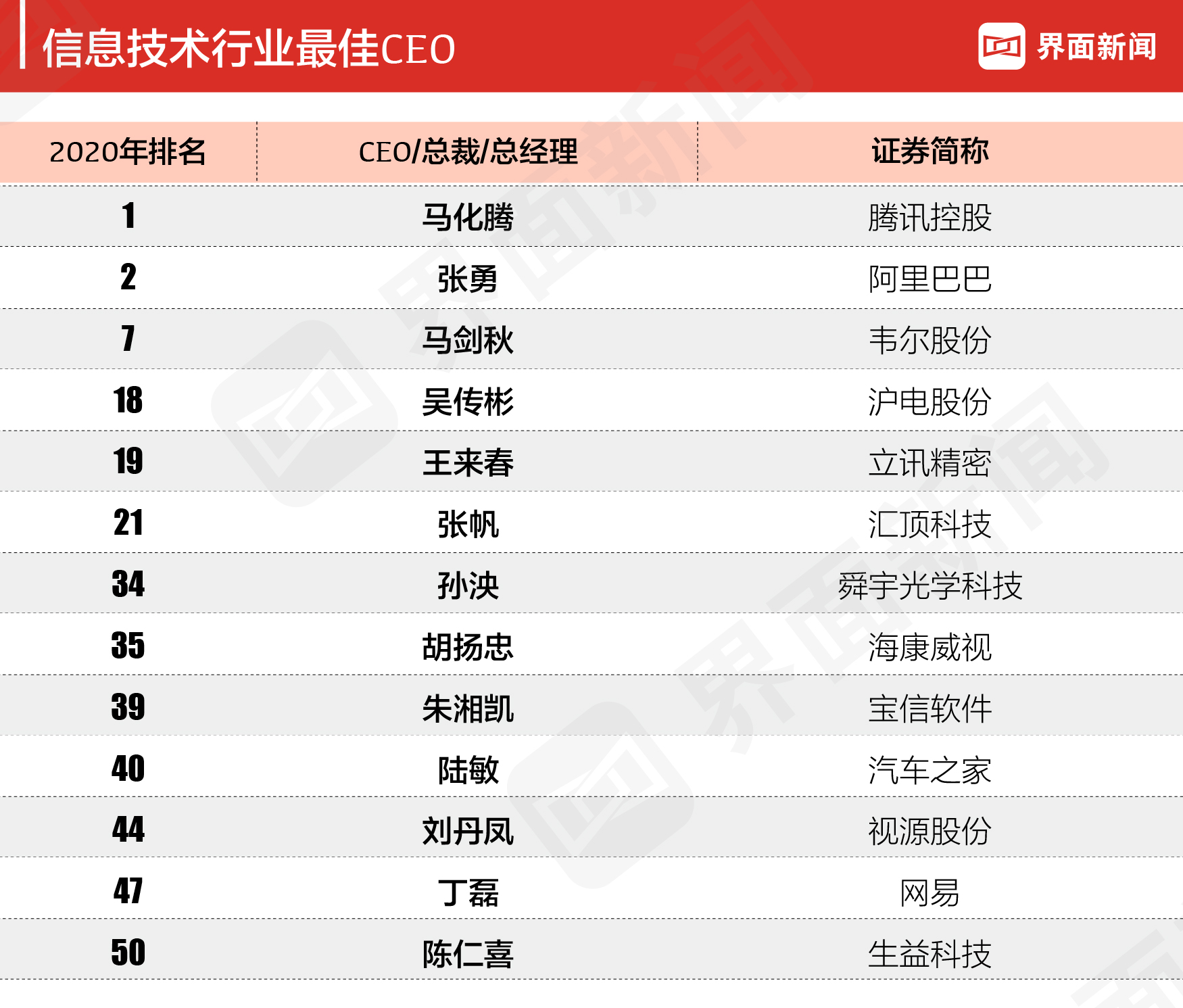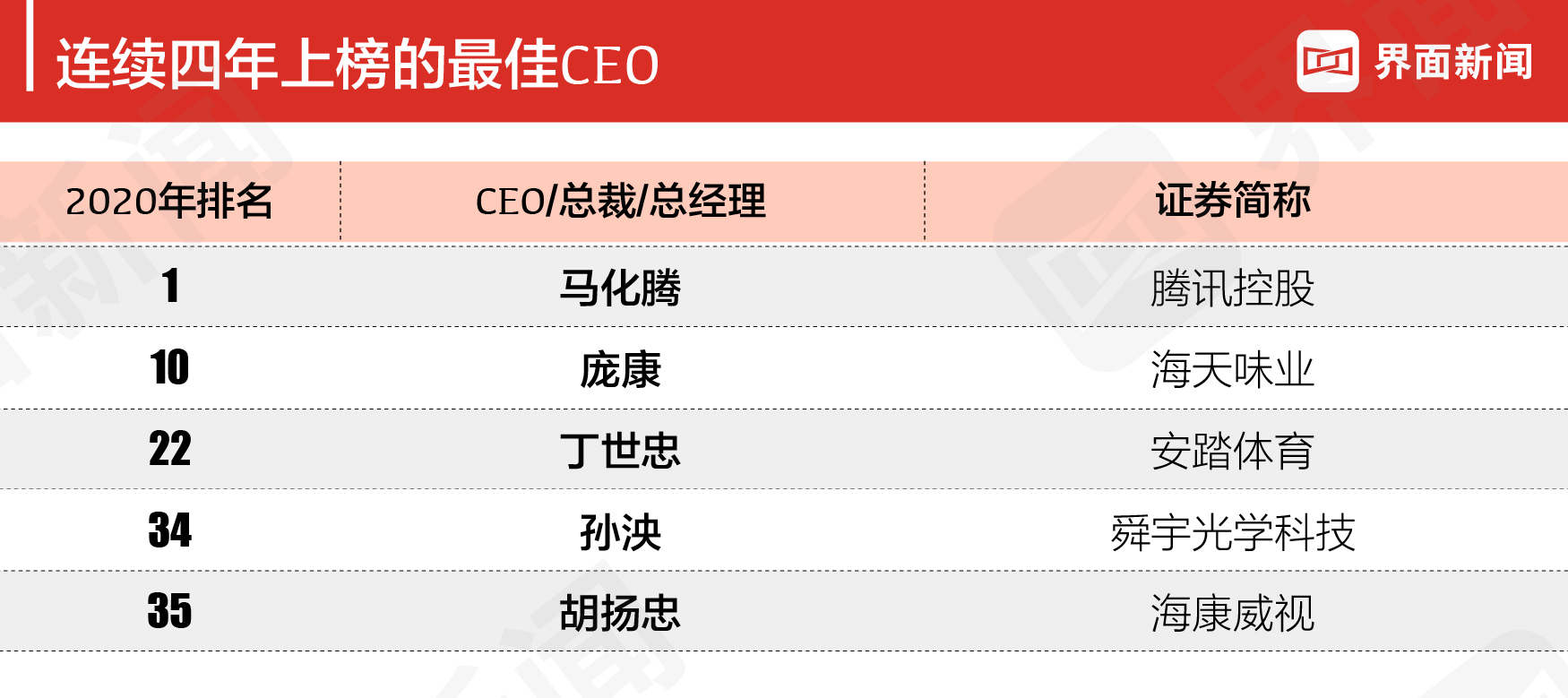 腾讯董事会主席兼首席执行官马化腾蝉联第一。阿里巴巴董事会主席兼首席执行官张勇也保持了第二的成绩。截止今年,共有5位最佳CEO连续四年登榜。