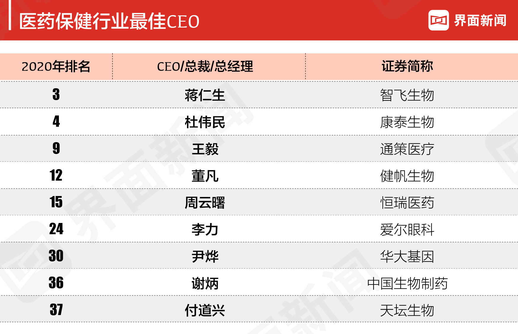 近年来,医药行业发展迅猛,在最佳CEO的前五名中有两名来自医药行业,分别是智飞生物的董事长兼总经理蒋仁生和康泰生物的董事长兼总裁杜伟民。