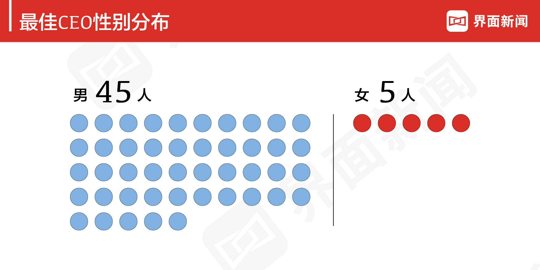 本次上榜的50位最佳CEO,平均年龄53岁,最年轻的CEO是视源股份的总经理刘丹凤(37岁)。除了具备优秀的管理能力和丰富的商场经验,CEO们还普遍受到过较高水平的教育,29位CEO拥有硕士及以上学位。最佳CEO榜单中有五位女性,相比去年增加一位,占榜单总人数的10%。