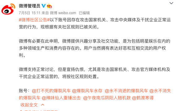 据微博管理员5日消息,以下账号因存在攻击国家机关、攻击中央媒体及干扰企业正常运营的行为,现根据有关社区规则已被关闭。