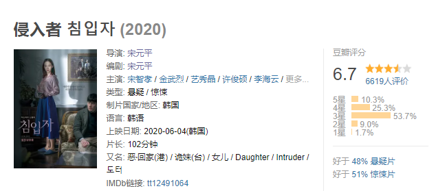《侵入者》由宋元平执导,金武烈、宋智孝主演。影片故事的前半段有点接近奉俊昊导演的《寄生虫》,都有点“鸠占鹊巢”的意味,上映第一周就击败了刚上映不久的好莱坞5亿大片《深海异兽》,成功拿下票房冠军,韩国评分网站Naver平台上打出了9.4的高分。