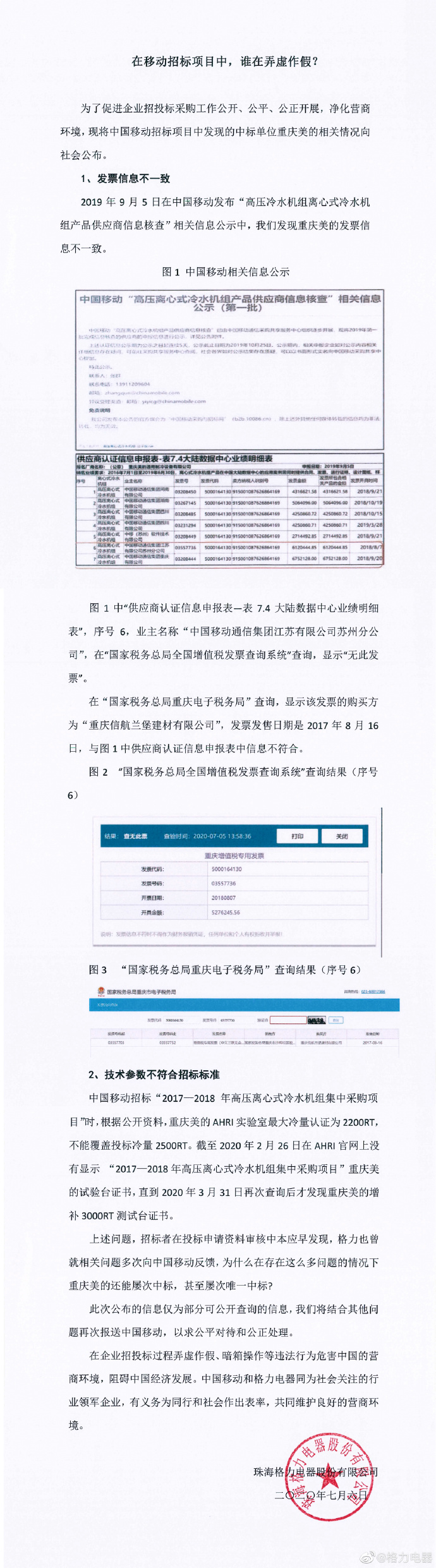 7月6日上午消息,格力电器今日发布公告回应“格力电器被中国移动取消中标资格一事”称,重庆美的发票信息不一致。此外,格力方面还表示,重庆美的相关技术参数不符合标准,但却屡次中标,甚至是唯一一家中标的供应商。