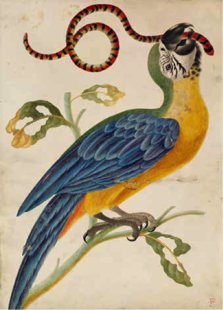 多萝西娅·格拉夫(Dorothea Graff)是博物学家玛丽亚·西比拉·梅里安的女儿。她在两幅画中分别描绘了产自南美洲的凯门鳄和蓝黄鹦鹉咬住一条珊瑚蛇的场景。尽管动物的姿势比较常见,但她在绘画时特别关注了动物的身体结构、颜色以及皮毛纹理。