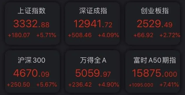A股再度迎接暴涨,两市红成一片,三大指数集体大涨:沪指暴涨逾5.71%,深成指大涨4.09%,创业板指涨2.72%;200多只个股封死涨停板,900多只个股涨幅超过5%。