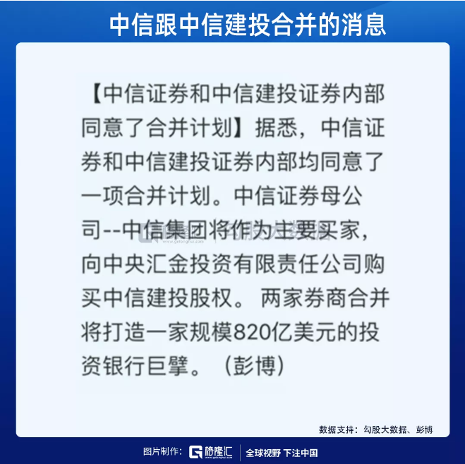 4月14号,A股市值最大的两家券商,中信跟中信建投合并的消息不胫而走,中信建投股价三个交易日大涨20%。随后,两家公司否认。