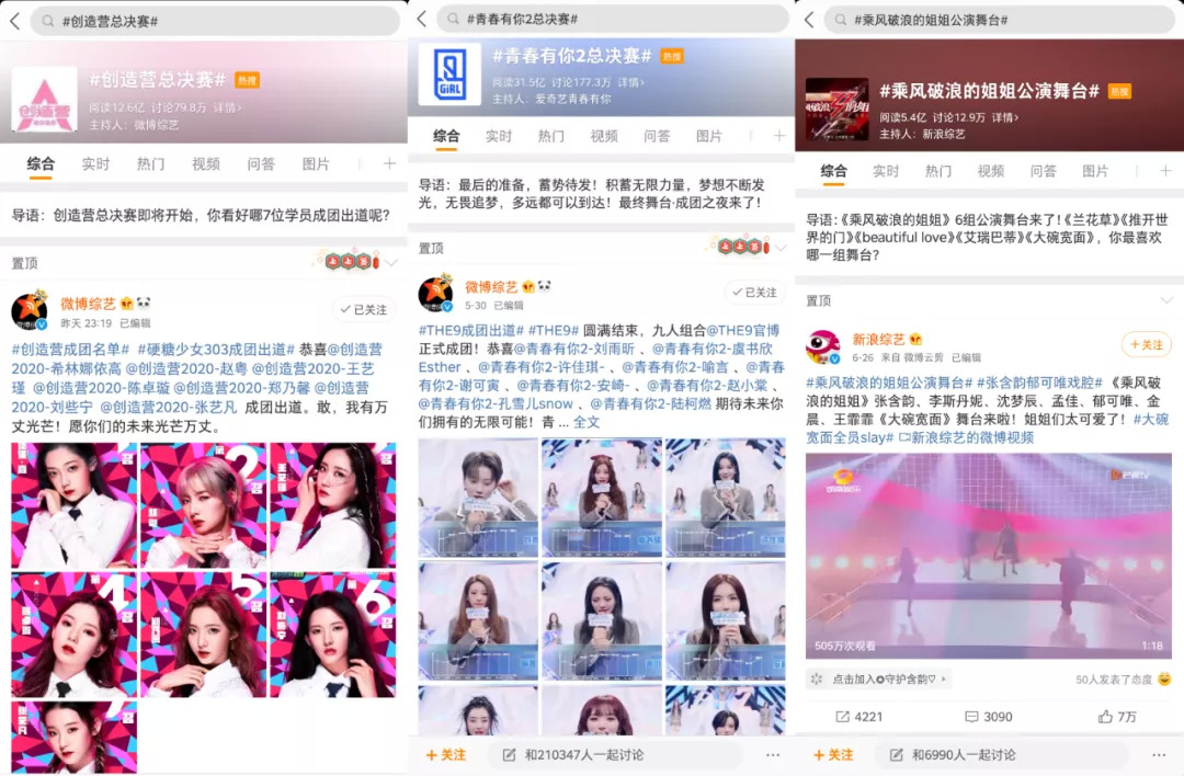 从微博话题搜索来看,创造营总决赛话题阅读量达到12.6亿,青春有你2总决赛有31.5亿的阅读,姐姐们公演舞台5.4亿。