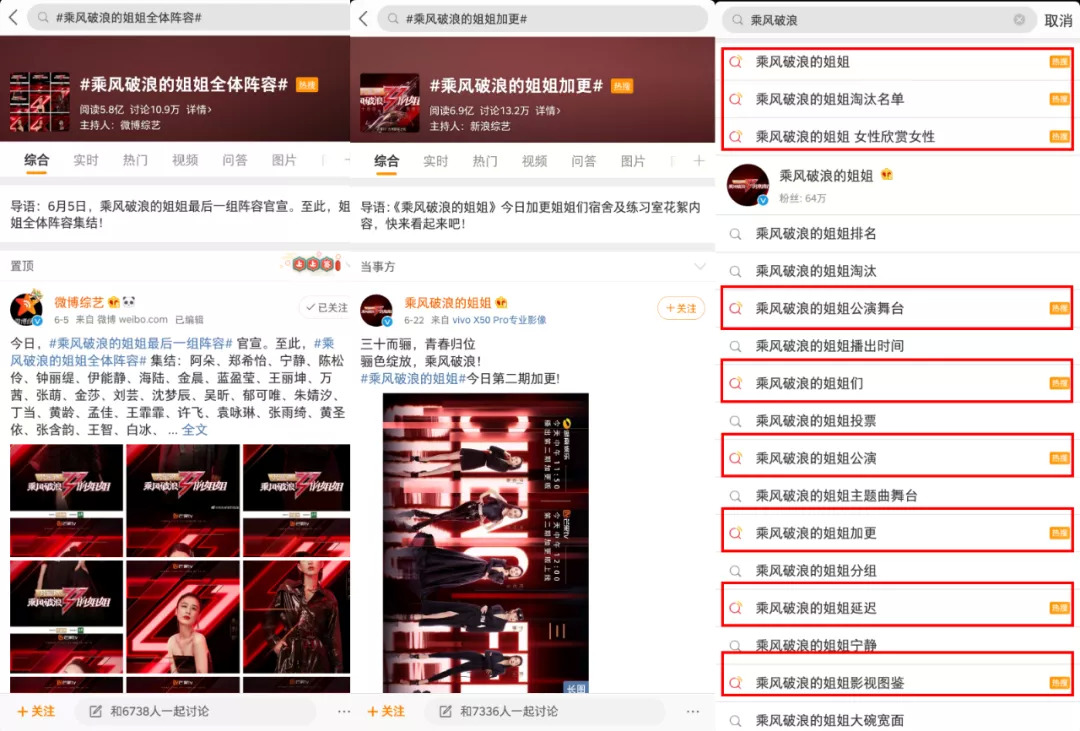《姐姐们》由于刚开播不久,对比的是第一次公演话题排行,不过从前期话题度来看,《姐姐们》的关注度并不局限于节目本身,每位姐姐自身的微博话题度都很高,宁静、伊能静、黄圣依、万茜、海陆等等。如果说《青2》和《创3》的流量关注度来自于节目本身,那么《姐姐们》则出现反哺的现象,姐姐们凭借自身粉丝力和大众关注度,再和《姐姐们》节目组、各位姐姐之间进行碰撞,无论是矛盾、对话细节、赛制还是评委等等,这些元素堆在一起合力激发一波又一波的热门讨论。