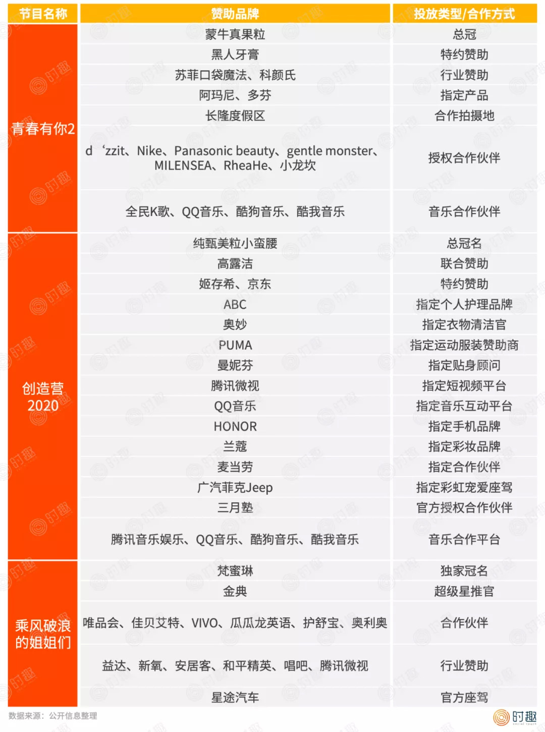 当然,除了高关注度以外,节目还要看市场价值,2020年在品牌营销预算普遍缩水的情况下,综艺电视剧招商频频遭遇瓶颈,但今年女团选秀节目可谓是品牌赞助的香饽饽,从饮品到洗护、美妆再到服饰等等。《青2》共有14家品牌赞助、《创3》有15家品牌。《姐姐们》也有15家。(PS:此处《青2》和《创3》未加入音乐合作平台》