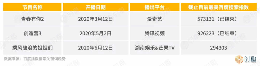 2020上半年赚足了大众们眼球的娱乐综艺节目,应该非偶像女团选秀节目莫属了,从《青春有你2》到《创造营3》再到《乘风破浪的姐姐们》,像是养成系女团连续偶像剧,追的人不少,从百度搜索指数和微博话题热度都能看出这类型节目实火。