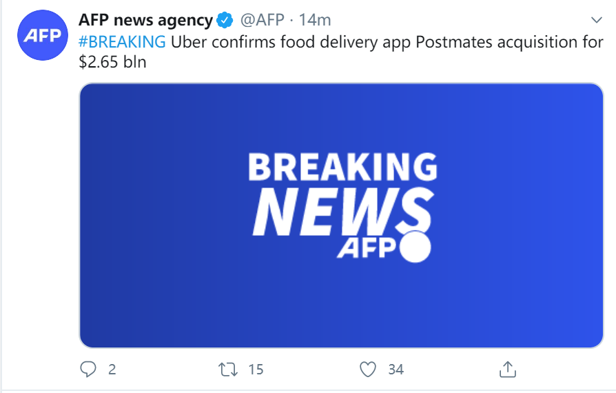 法新社6日刚刚消息,Uber确认以26.5亿美元收购外卖应用Postmates。