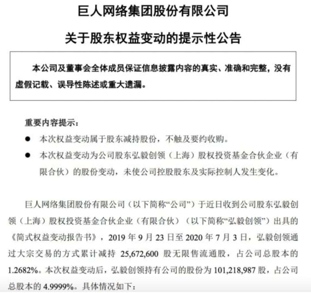 这并非弘毅近期的唯一减持案例。也是在昨天,巨人网络的一则公告显示,弘毅投资的另一投资主体“弘毅创领(上海)股权投资基金合伙企业(有限合伙)”完成了减持计划。权益变动后,弘毅创领依旧持有巨人网络近5%的股份。