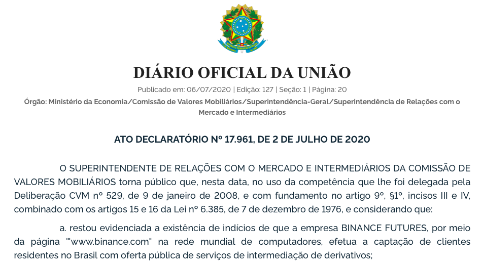 当地时间6日,巴西证券交易委员会(COMISSÃO DE VALORES MOBILIÁRIOS,CVM)发布文件称,币安期货公司通过币安官网公开提供衍生品中介服务吸引居住在巴西的客户。