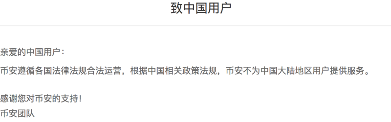 2018年2月,币安官网发布公告致中国用户称,据中国相关政策法规,币安不为中国大陆地区用户提供服务。在被曝出上海设立办公场所后,币安方面曾予以否认。目前,币安中国在上海临港设立研究院。对于上述中文网站,币安在6月曾对央广网回应称是测试网址。