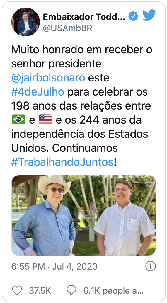 上周日,巴西外交部长阿劳霍在社交媒体上发布了一张照片,照片中他与博索纳罗以及其他人一起,出席了在美国驻巴西利亚大使馆举行的独立日庆祝活动。照片中,没有人戴口罩,也未保持社交距离。