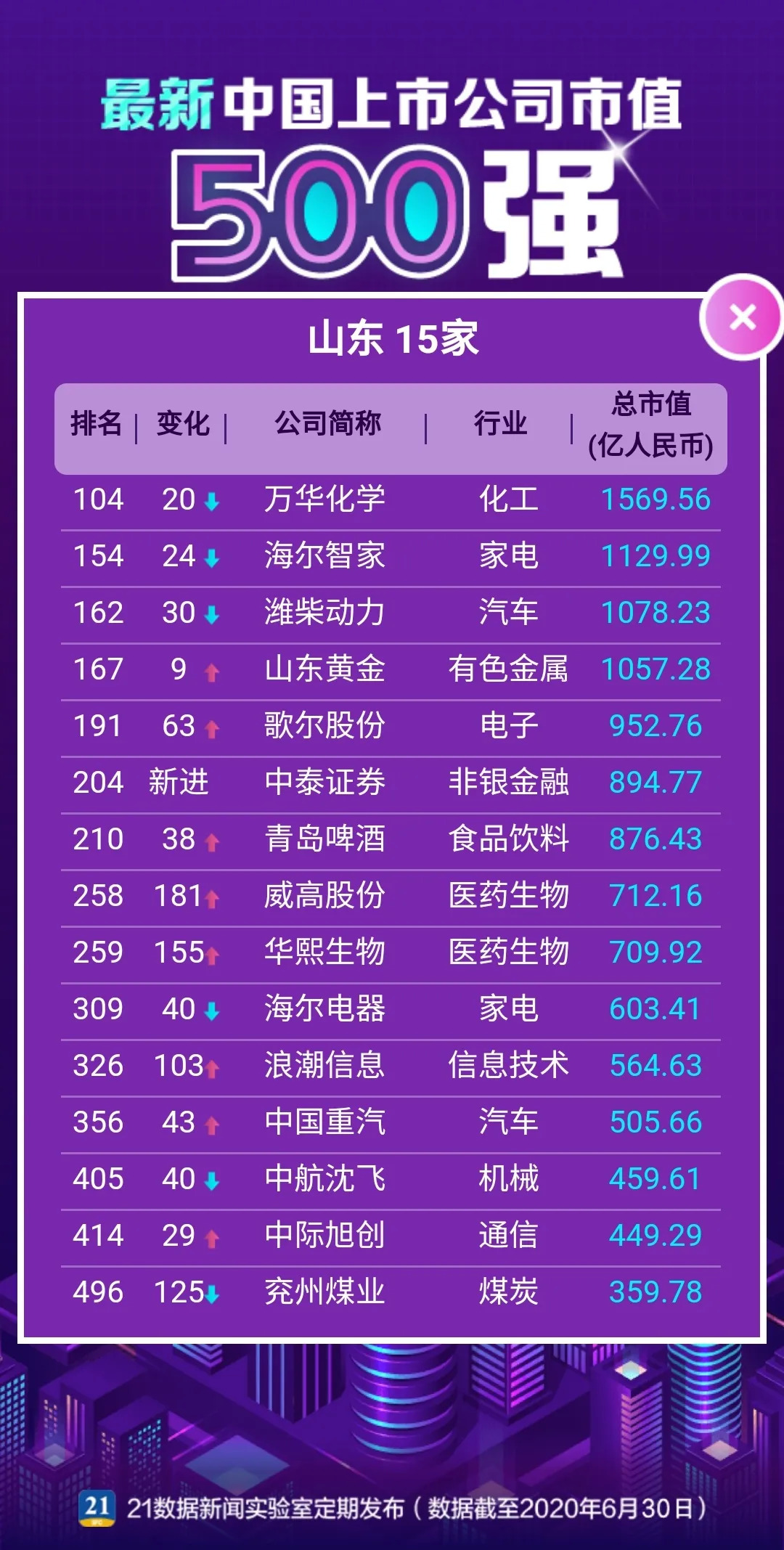 日前,中国上市企业市值500强排行榜单正式发布。其中,北京依托总部经济这一发展新引擎,以96家排名第一。作为经济大省的山东,较2019年末上榜企业数量减少4家,以15家与福建并列第8。