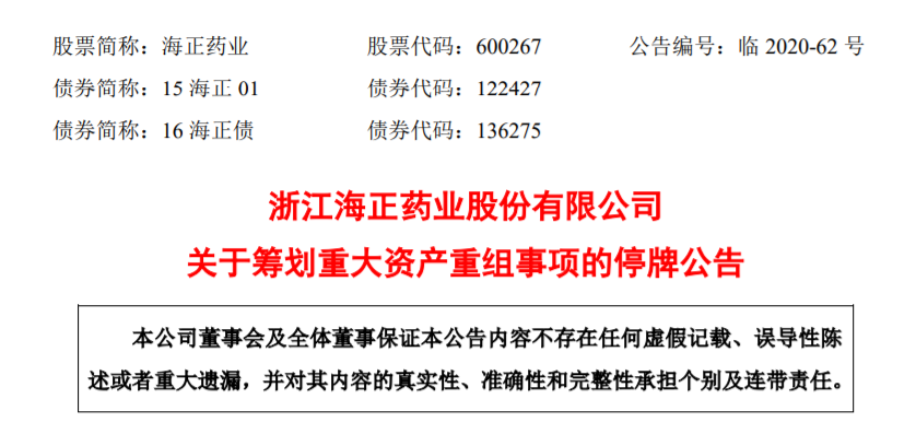 7月7日,海正药业发布公告称,公司正在筹划重组事项,拟通过发行股份、可转换公司债券及支付现金向 HPPC Holding SARL(以下简称 “HPPC”)购买瀚晖制药有限公司49%股权, 并募集配套资金。本次交易构成关联交易,预计构成重大资产重组,不构成重组上市。公司股票自2020年7月7日下午开市起停牌,预计停牌时间不超过10个交易日。