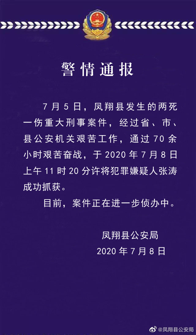此前,警方发布悬赏通告,7月5日上午,凤翔县发生一起重大刑事案件,造成两死一伤。经公安机关侦查,犯罪嫌疑人张涛有重大作案嫌疑。凡提供线索抓获犯罪嫌疑人,公安机关奖励人民币三万元。