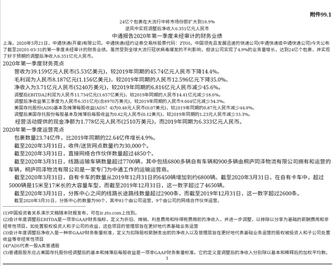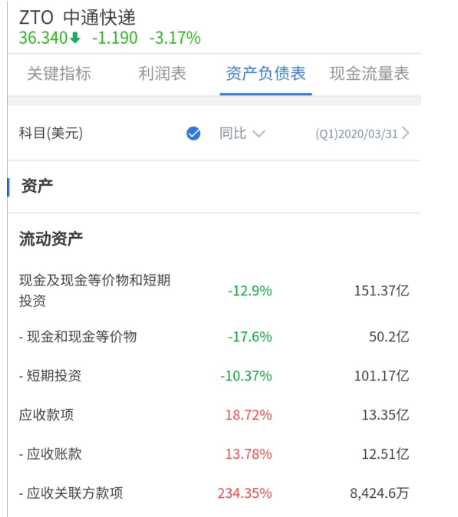 图源:中通2020年第一季度财报截图